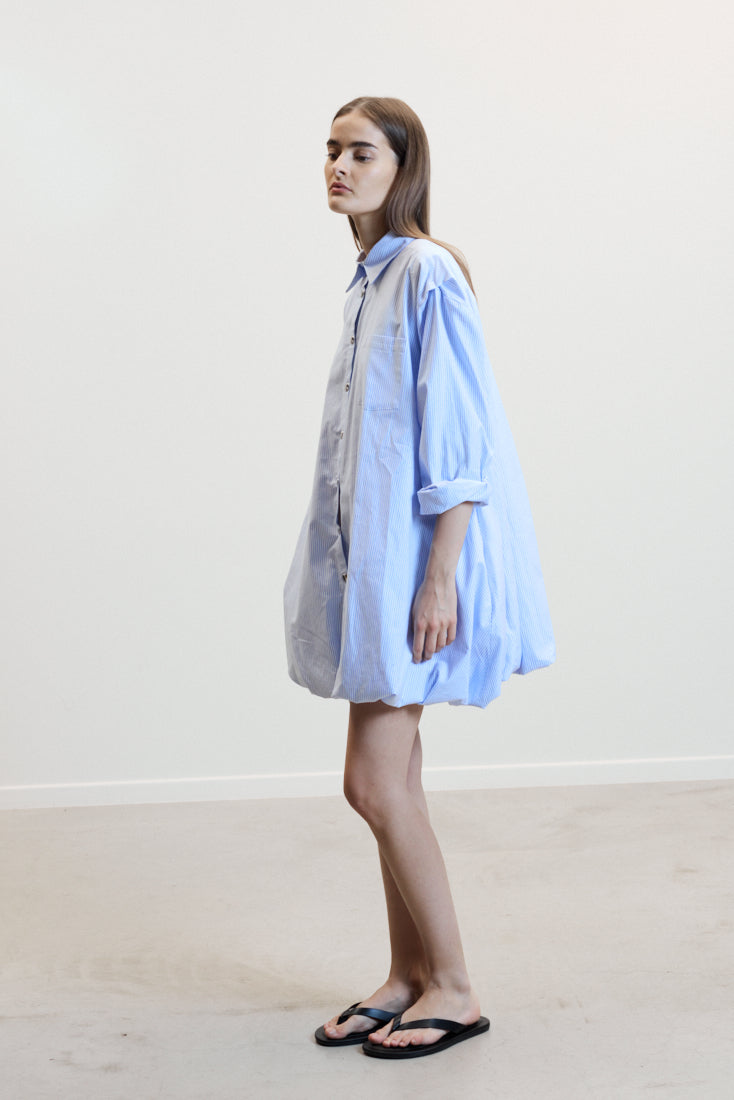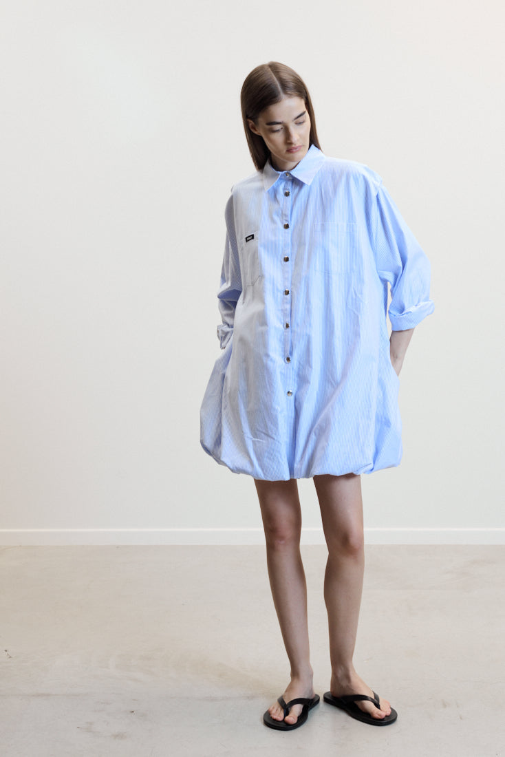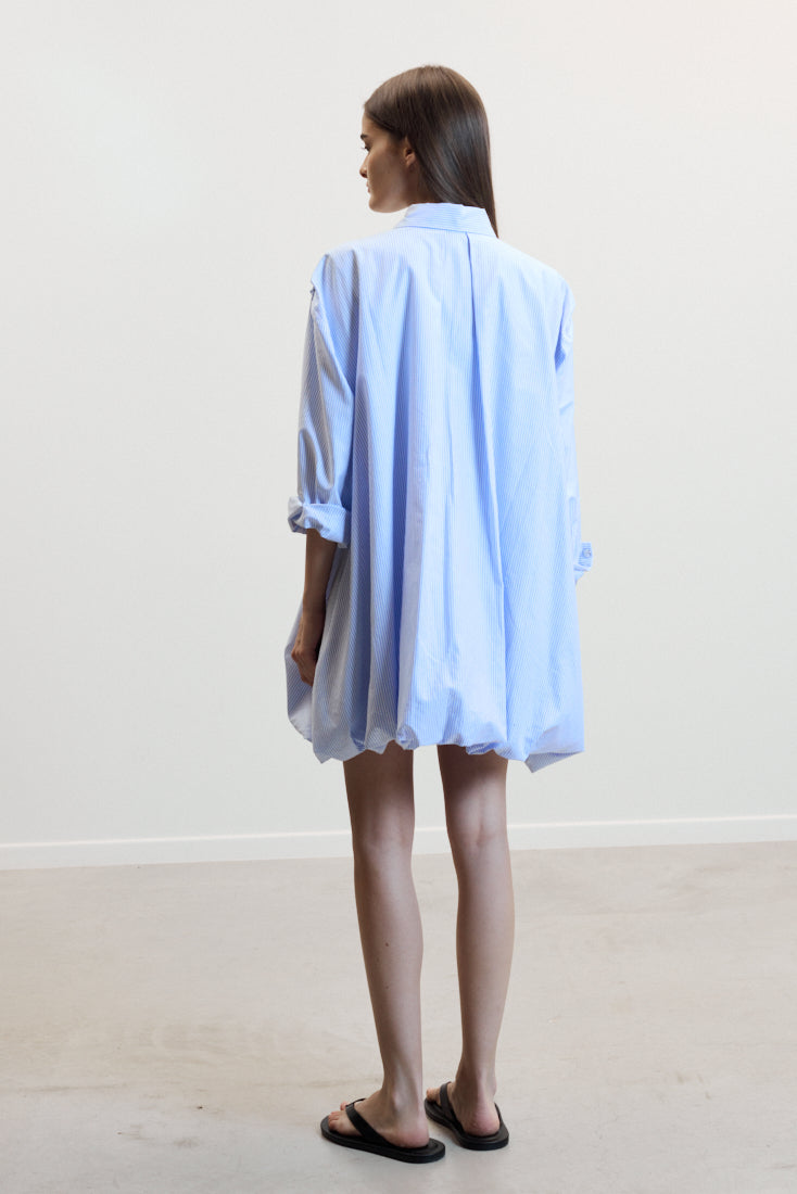 The SOFIA dress in fine blue white stripe combines effortless elegance with contemporary ease. Its shirtdress silhouette with a bubble hem and snap buttons creates a relaxed, seasonless look, perfect for everyday wear or layered styling.