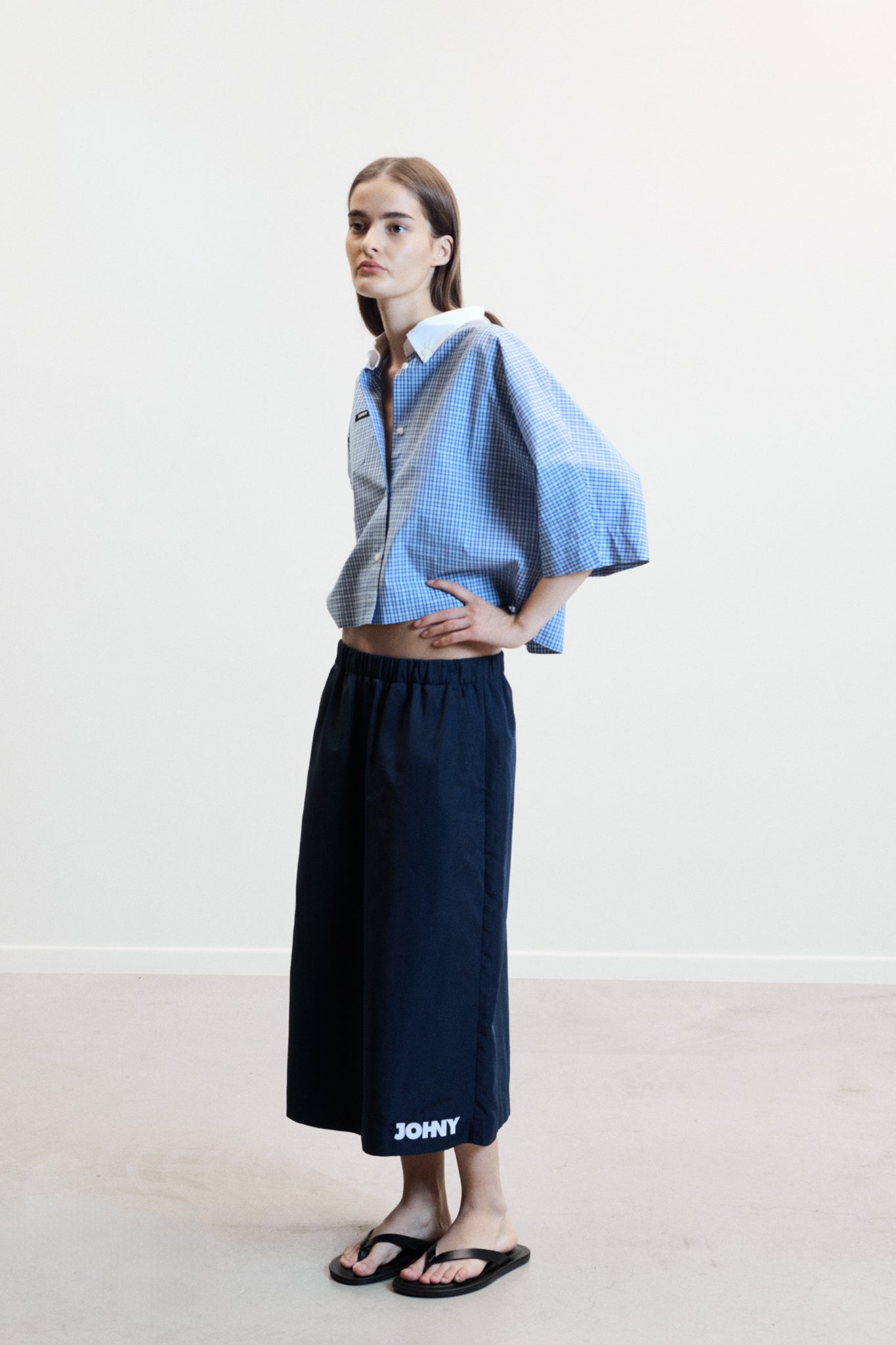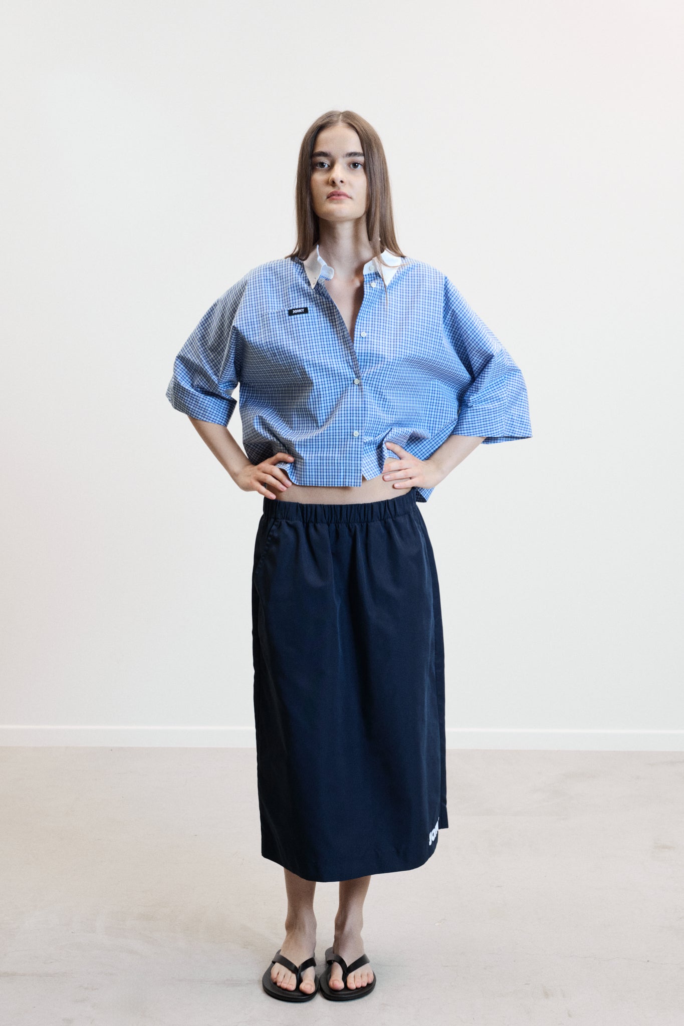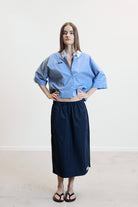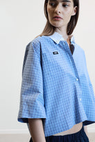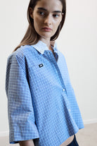 Effortless and contemporary, the BERRY shirt in blue check is a cropped silhouette designed for modern ease. Crafted in soft cotton with a crisp white button-down collar, it balances comfort and structure for a seasonless, versatile wardrobe essential.