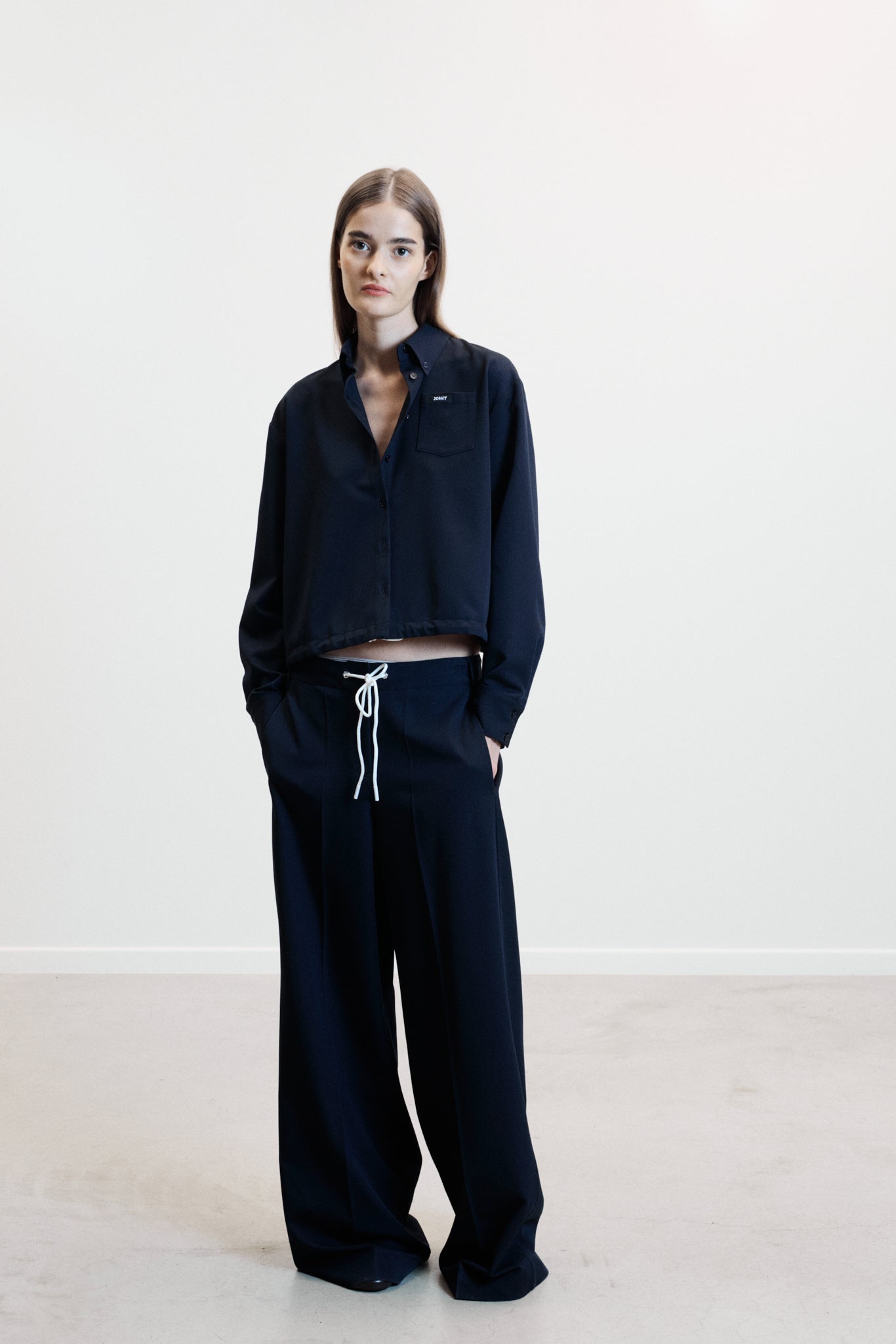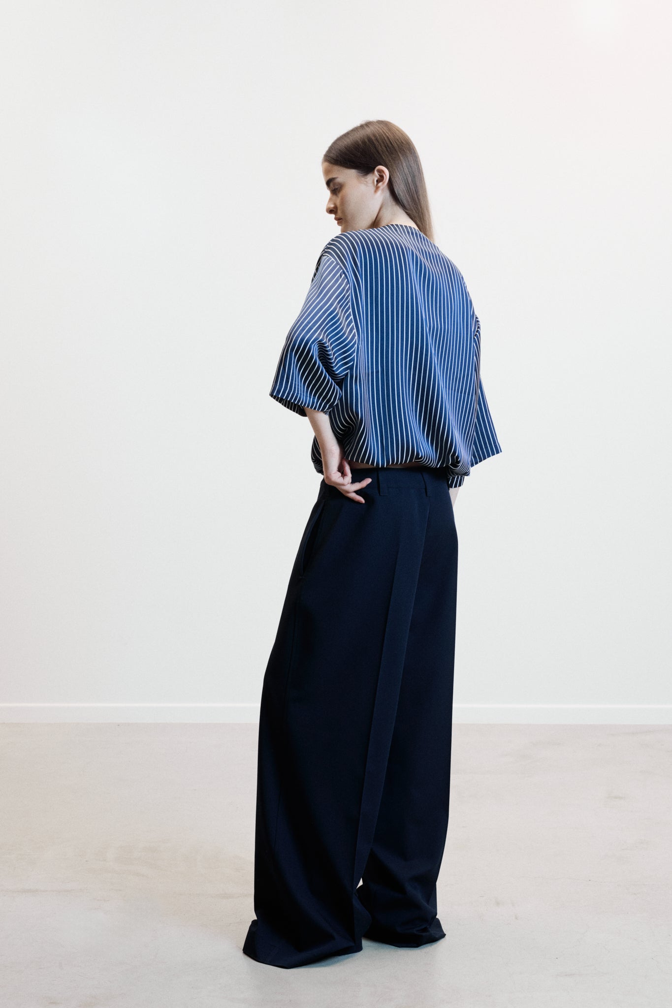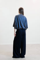 The KYRA trousers in blue offer an effortless, contemporary silhouette with a wide-leg shape and adjustable drawstring waist. Their fluid movement and minimalist design give them a seasonless, refined presence. Clean, relaxed, and confidently understated.