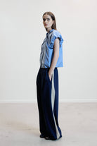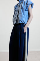 The AYO trousers in navy with pinstripe feature a wide-leg silhouette with an elasticated waistband and contrasting seam for a contemporary, seasonless appeal. Minimalist and effortless, they combine structure with ease in twill cotton fabric.